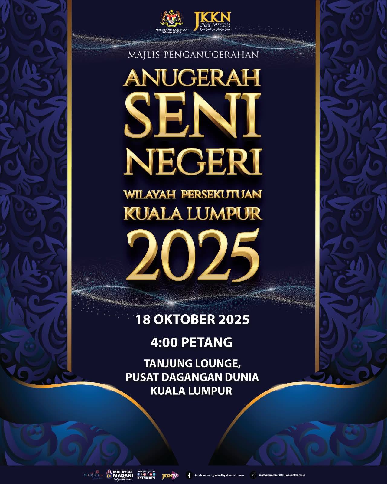 Majlis Penganugerahan Seni Negeri Wilayah Persekutuan Kuala Lumpur 2025 telah berlangsung pada 18 Oktober 2025 bertempat di Tanjung Lounge, Pusat Dagangan Dunia Kuala Lumpur. Majlis diserikan dengan kehadiran YBrs. Encik Ismadi bin Sakirin, Pengarah Eksekutif (Pembagunan Sosioekonomi DBKL) mewakili Datuk Bandar Kuala Lumpur dan YBrs. Encik Mohd Amran bin Mohd Haris, Ketua Pengarah JKKN.